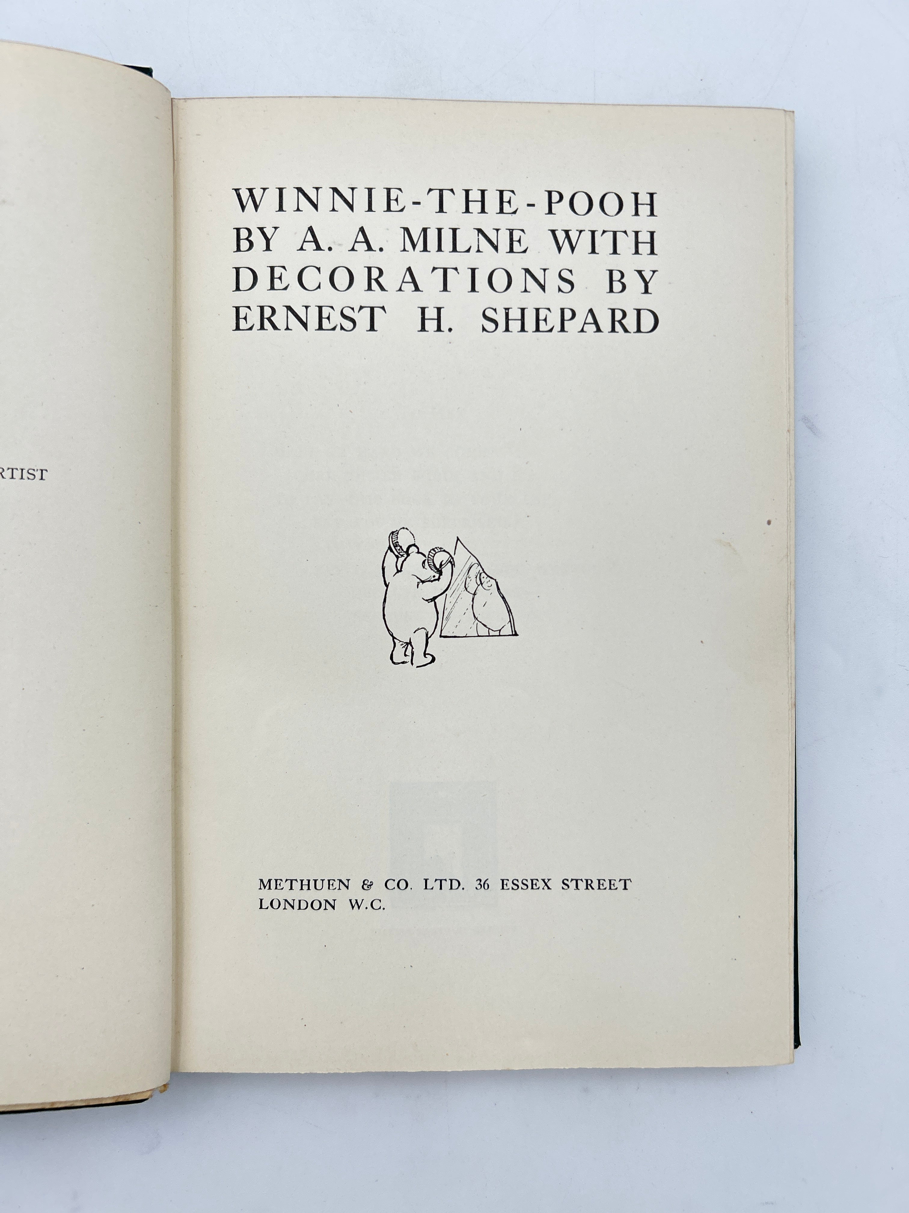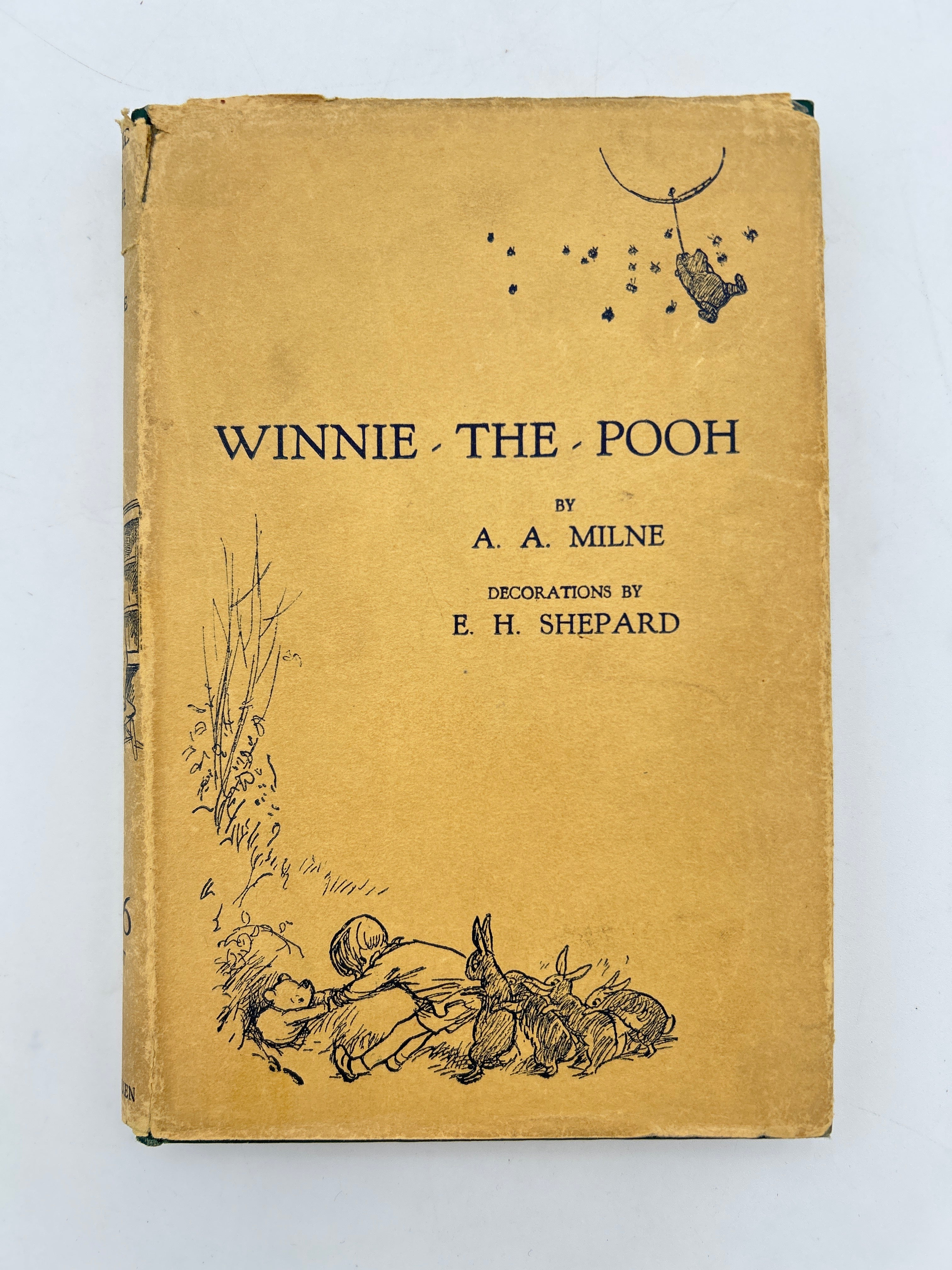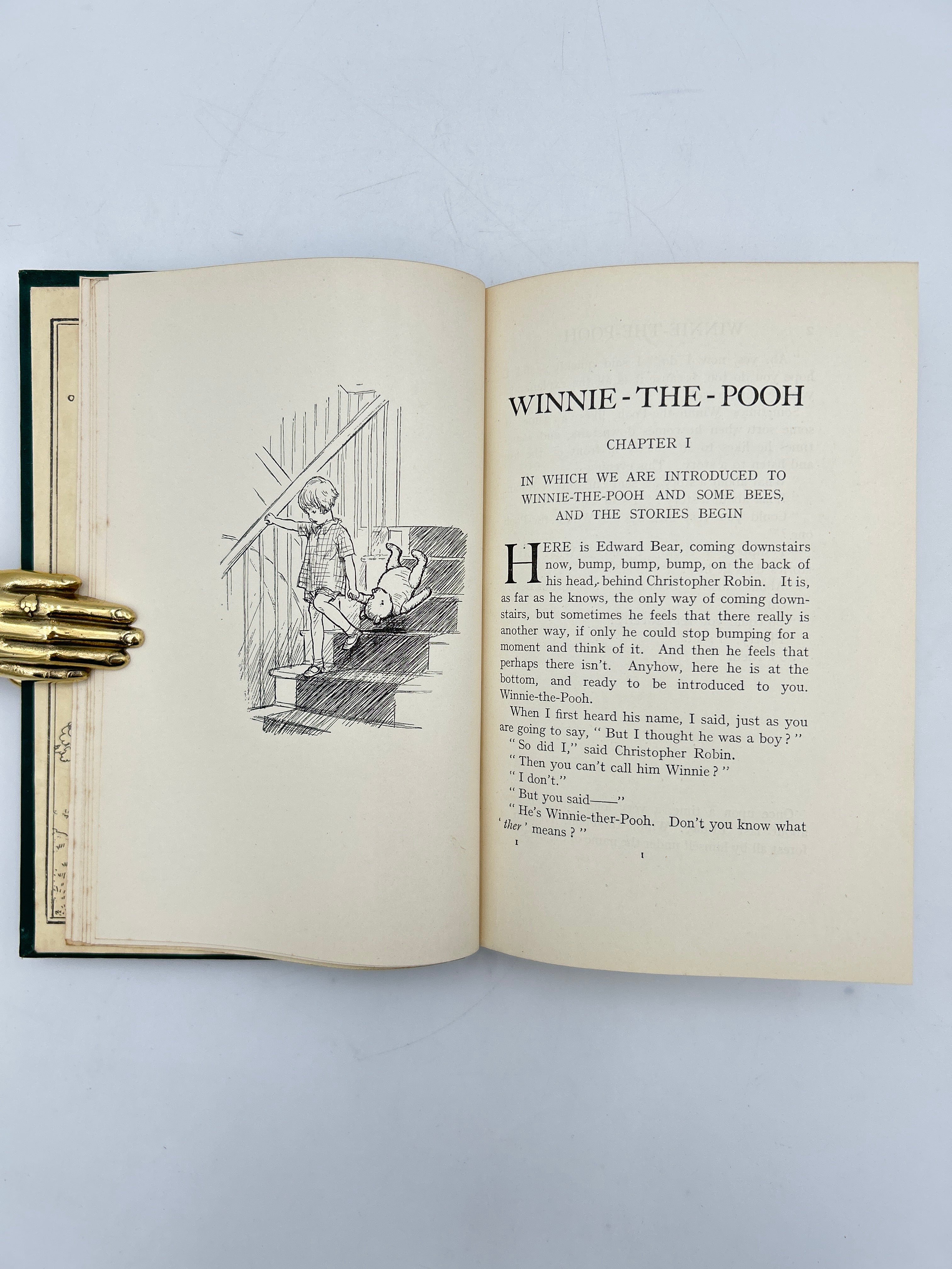 Green canvas binding with gilt illustration and borders on upper board. Map endpapers of the Hundred Acre Wood with yellowish shadow down the page. Illustrations throughout. Minimal bumping to points and edge wear to foot of spine. Very fine condition.