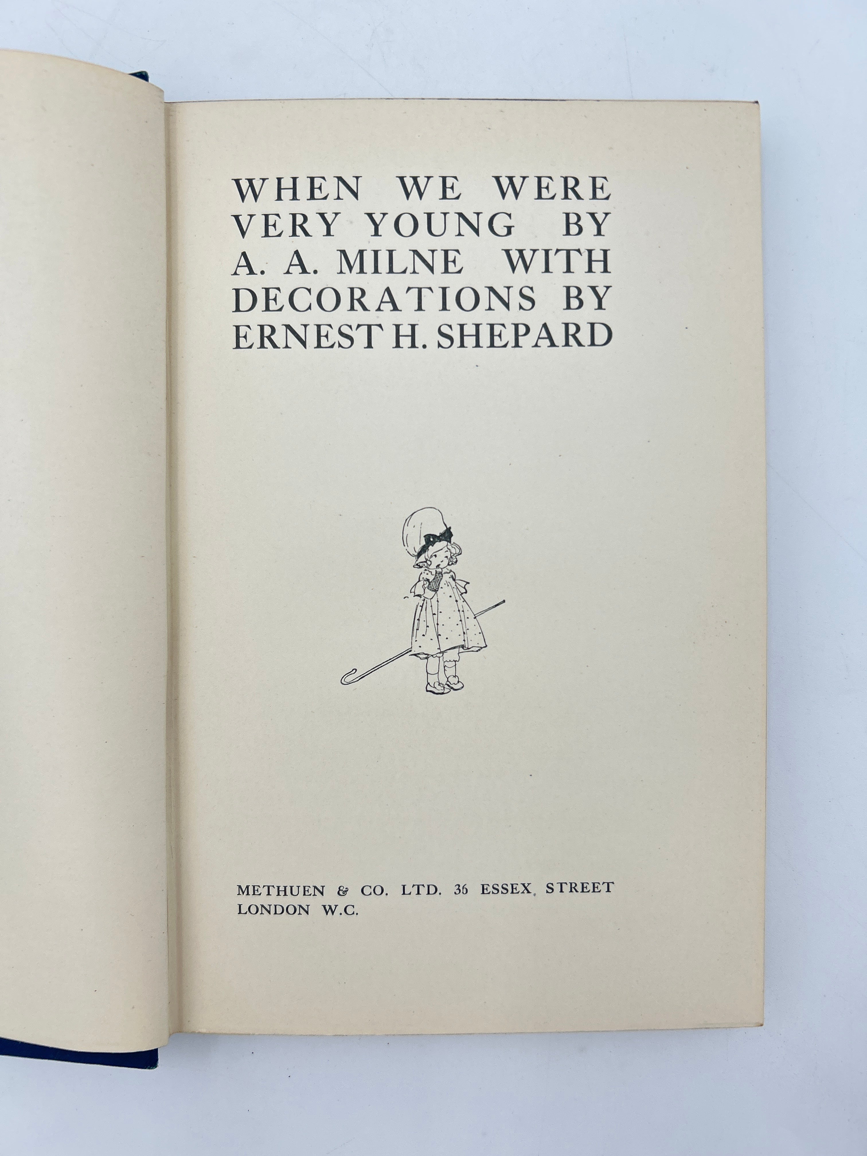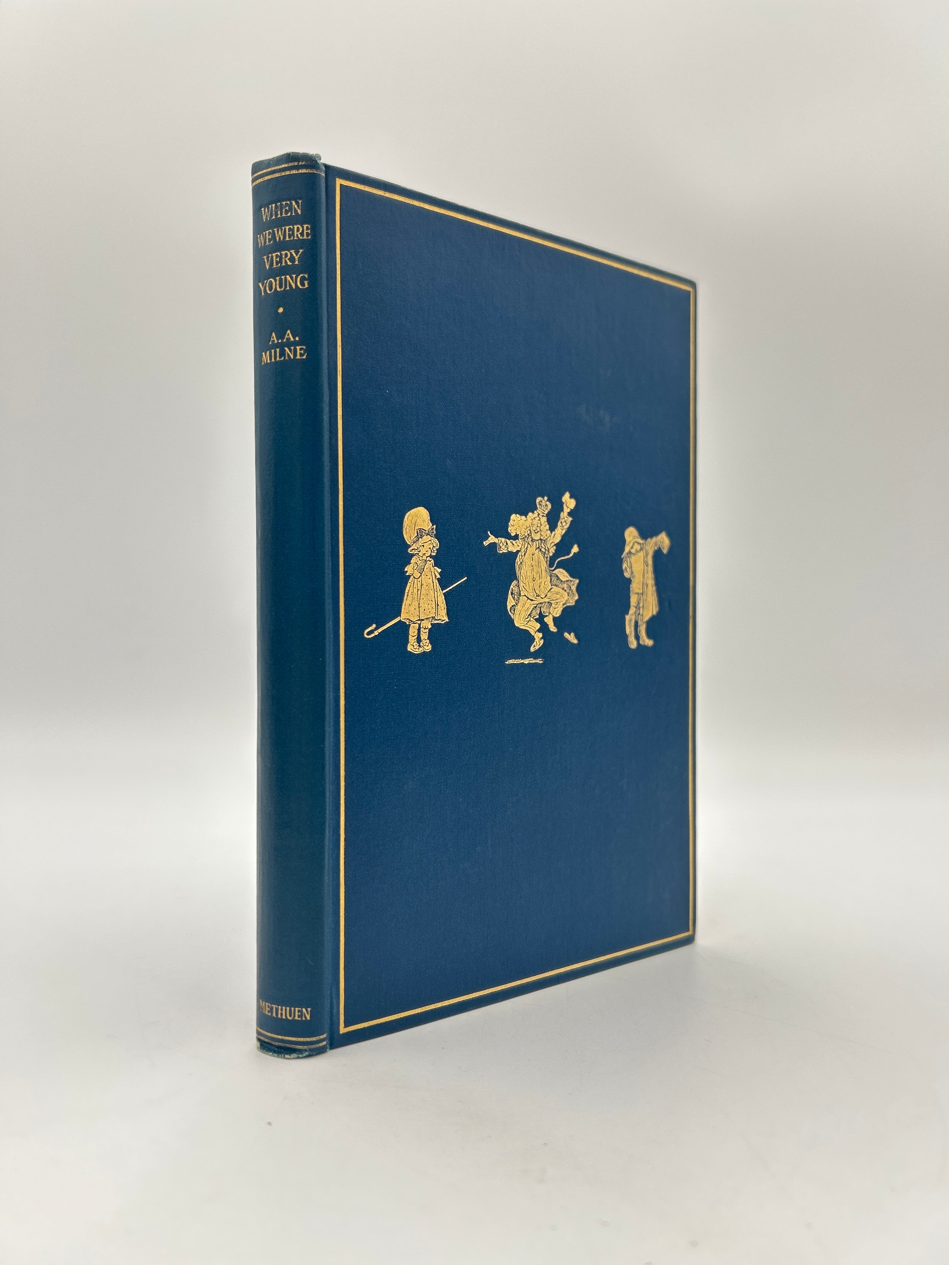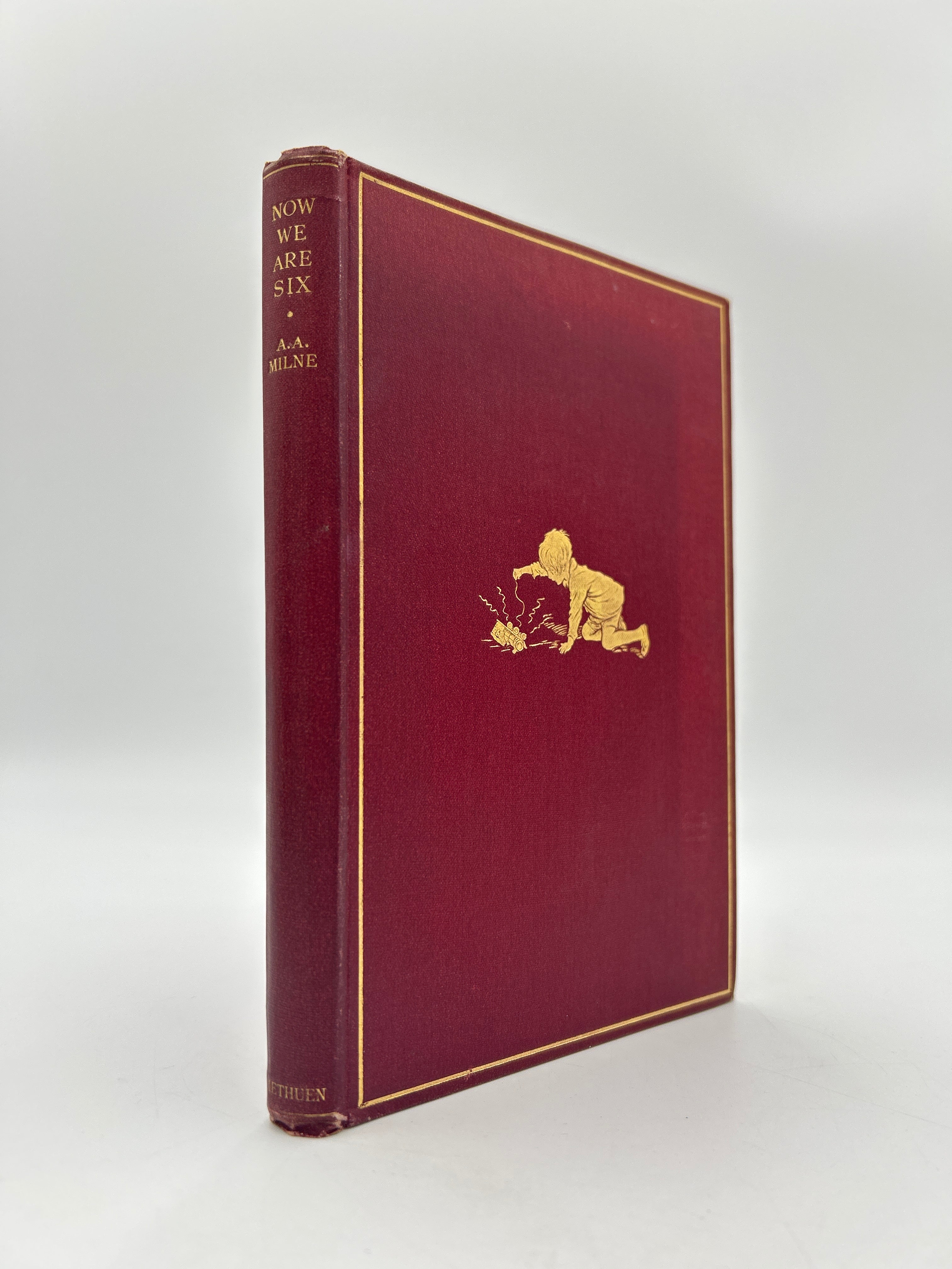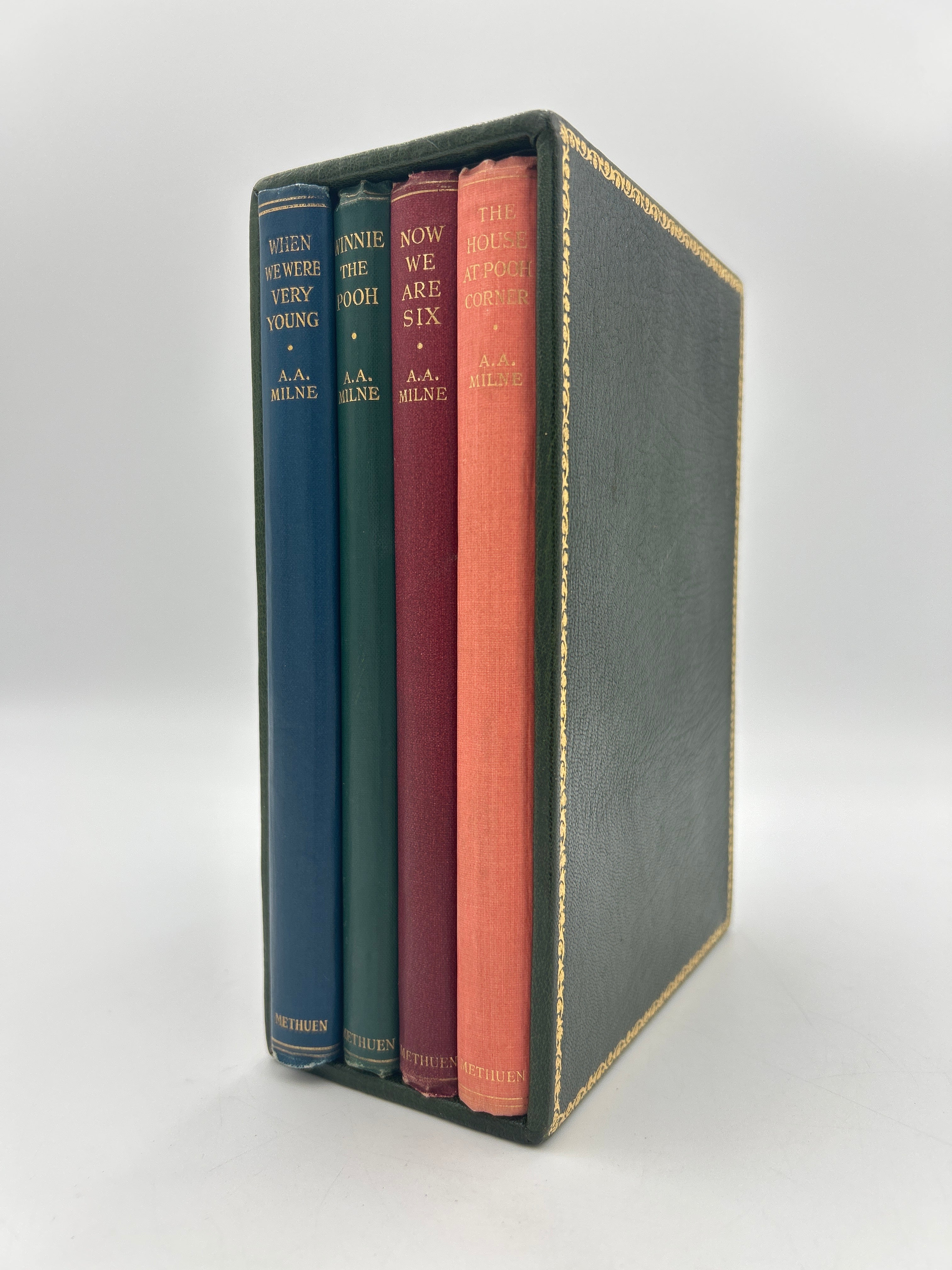 Each book in blue, green, red, and pink cloth binding with gilt illustration to upper and lower boards with gilt lettering to spines. Each book illustrated throughout. All first editions. Housed in custom slipcase with five raised bands and gilt lettering and decorations. Points bumped on each volume. Gilt top edges. Pictorial endpapers except for When We Were Very Young which also has bookplate to inner board of Frederick John Hancock Lloyd. Winnie the Pooh has upper right corner torn of final endpaper and last illustrated page without any damage to the image or text. Now We Are Six with browning to fore edge. The House at Pooh Corner has some sun fading to upper board. All fine condition.
