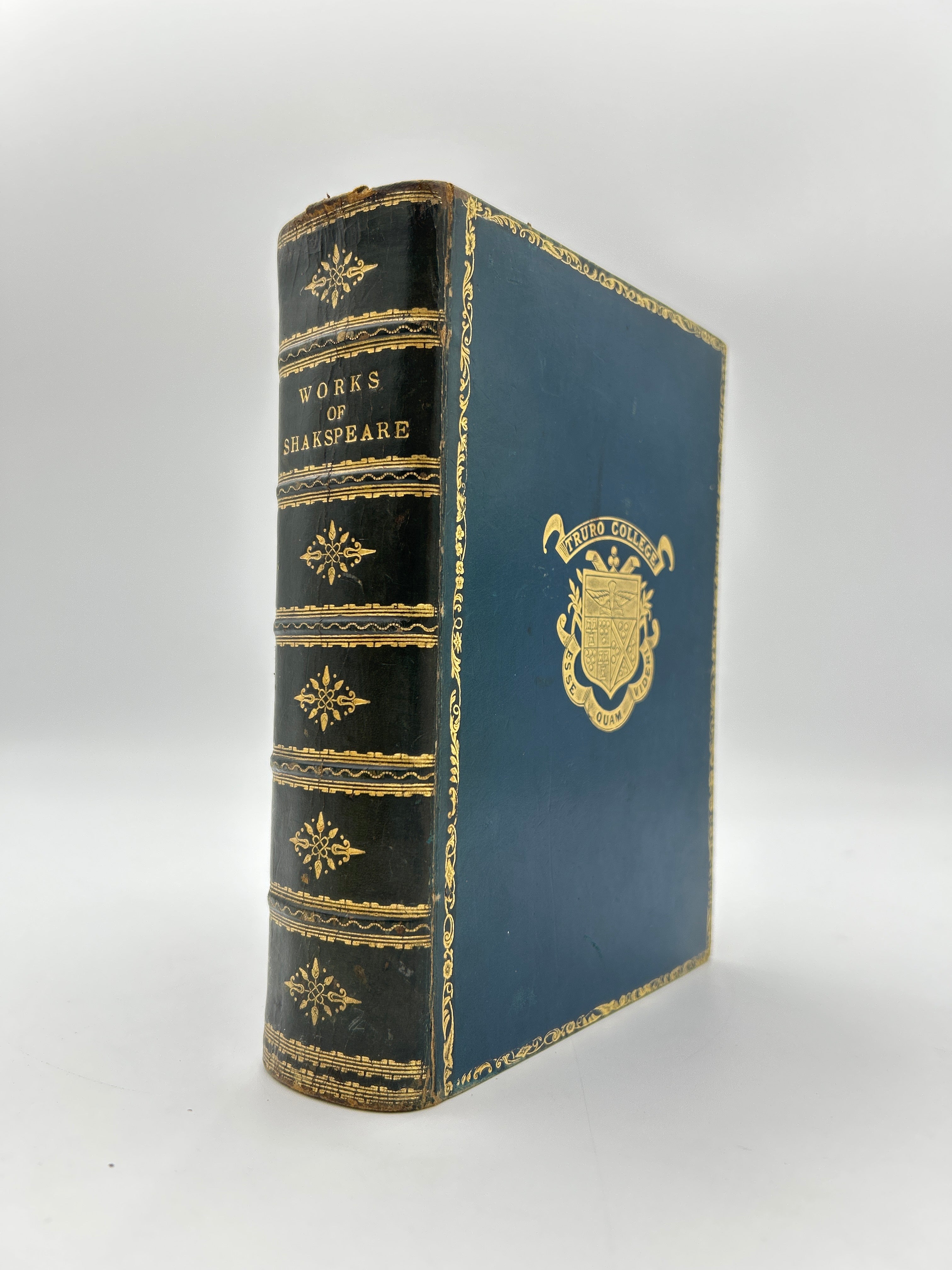 Navy leather binding with gold emboss college insignia on front, five raised bands on spine with design embossing between bands, title label on top spine, three edge marbling, marble end papers, very good condition.
